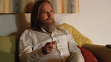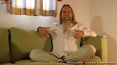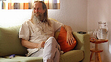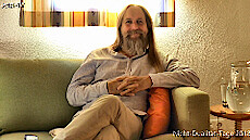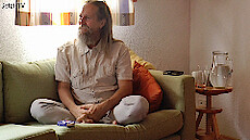 „Flying Sofa“, es wird nicht erklärt, was das ist und Amrit weiß es auch nicht; die einzelnen Teilnehmer sitzen vorne, hier darfst du fragen, Geschichten erzählen, gut gegessen? Ja; du weißt auch das alles, was du siehst, bist du? Alles, was ich sehe? Amrit sieht das auch; so, wenn du eine Frage hättest, was wäre das? Schön diesen Raum mit Amrit zu genießen, wo gar keine Frage ist; die Frage ist vielleicht, warum geht es so schnell in Armits Gegenwart, dass sich der Raum auftut und dieser Frieden da ist? Wahrscheinlich, sie haben es nie geschafft Amrit zu dressieren, er ist immer ein wenig undressiert geblieben, wenig Struktur oder vielleicht ist Amrit einfach so dumm, nichts bleibt hängen, das wissen wir nicht; ja, es ist so still in Amrit drinnen und er weiß nicht, wie es funktioniert, aber wenn er so herum schaut dann sieht er keinen, da ist schon eine Form da und es wurde gesagt, wie du heißt, aber es ist trotzdem schwierig, da etwas von zu machen, es bleibt leer irgendwie, wie ein Eimer mit einem Loch oder so: Es bleibt nichts hängen, Goldfischsyndrom, und ja, da kannst du dann nichts mit machen, wenn da keiner ist oder keine Struktur, und dann bleibt bei dir auch nicht so viel, weil die Geschichten sind immer Ping-Pong, hin und zurück, hin und zurück, und so halten wir die ganze Welt imstande, hin und zurück; Amrit hat nur eine Bitte und diese Bitte ist, weil Amrit hat selbst so ein Fehler gemacht, er hat gedacht, dass da draußen, das, was er sieht da draußen, er nicht ist; nur weil in Amrit nichts los ist und du spürst diese Stille, dann heißt es nicht, dass es seine oder deine Stille ist, vielmehr wird deutlich, es hat so lange bei Amrit gedauert: Er hat es immer da draußen gesehen, wow, so eine Stille, aber da ist keiner da; so, es ist nicht mal Amrits Stille, es ist nicht deine Stille, es ist Stille, wenn dieses Meer mit den Wellen einfach, wenn der Wind weggeht und da nur Meer ist, welche Welle ist schuldig? Welche Welle hat das getan? Keine, es ist deutlich, es war keine Welle, ja und so ist es auch hier, und das ist, was Amrit uns wirklich bittet, nicht weil Amrit da sitzt, es passiert, dass hier ein Freundes-Treffen ist, ohne dich wäre es nicht möglich; es ist wunderschön, ja, befreiend, du bist das, das ist das, beschreibe das! Es ist unbeschreiblich, und sonst? Es gibt ein Grund, warum Armit fragt; es ist eine Tiefe; wie tief? Ohne Anfang, ohne Ende und das hier entspannt sich und genießt; wäre es okay, gefilmt zu werden? Das würde das System aktivieren; ah, dann haben wir etwas, was wir ansehen können; aber höchstens geht es total falsch, höchstens funktioniert nichts, sterben vielleicht am Herzinfarkt, das ist nur kurz, meistens das Erlebnis, dann legen wir dich zur Seite...#Mehr...# und na ja; es ist dann ein Soforterlebnis, wollen wir das probieren? Ja, gerne; (die Plätze werden getauscht); beschreibe, was anders ist, wenn etwas anders ist...; wie viele Gedanken gibt es in diesem Moment? Es ist immer noch Tiefe, es liegt nicht an Amrit, es liegt am Sessel, „Flying Sofa“, flying Sessel; und du brauchst nichts verstehen, du kannst nicht mal etwas verstehen, du kannst höchstens glauben etwas zu verstehen; Amrit hat einmal drei Ärzte in Wien gefragt, was macht, dass der Arm sich bewegt? Und nach ein bisschen hin und her haben sie zugegeben, sie wissen es nicht; dieses, was Leben heißt, das können sie nicht erklären, was das ist; was wissen wir eigentlich wirklich? Und dann bleibt nur sitzen, Wundern bleibt übrig, aber Entschuldigung, Amrit hat wieder das ganze Bild genommen, es geht um den Tausch jetzt, der Freund ist jetzt der Guru, was möchte er teilen, etwas von jetzt, was wäre das? Etwas, das, was man nicht mit Worten sagen kann, das, was eine Tiefe oder Frieden ist; wie erreicht man das? Was muss man tun? Hat nichts gemacht, hat sich nur hierher gesetzt; nichts gemacht, könnte das der Schlüssel sein? Eine Pause machen vom Machen und Tun, einfach ohne Programm, ohne wissen zu wollen? Ja, stimmt...; Amrit hat keine Idee, und hat einfach Frieden damit gemacht, nicht zu wissen ist dann zum Wunder geworden, es ist so einfach, das Nicht-Wissen, da ist er so lange vor geflüchtet, hat sich dafür geschämt, hat probiert, alles Mögliche zu wissen, um das zu verstecken, und als er aufhörte davor wegzulaufen…, und es ist nicht freiwillig geschehen, er war so müde vom Müde-Sein, es ist nicht so, dass er wäre brav gewesen, im Gegenteil, Amrit konnte nicht mehr flüchten, und dann hat er dieses Nicht-Wissen einfach kommen lassen und hat entdeckt: Nicht-Wissen und Wunder ist das gleiche…, und noch weiteres „Flying Sofa“ mit Amrit, herzlichen Dank.