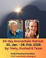 Online-Satsang Wochenende mit Venu & Isaac Sa 1.11. bis So 2.11., jeweils 9 bis 10:30 Uhr / Pause / 11 bis 12:30 Uhr (deutsche Zeit) auf freiwilliger Zahlungsbasis, Zoomlink erhalten unter: info@retreatzeit.de